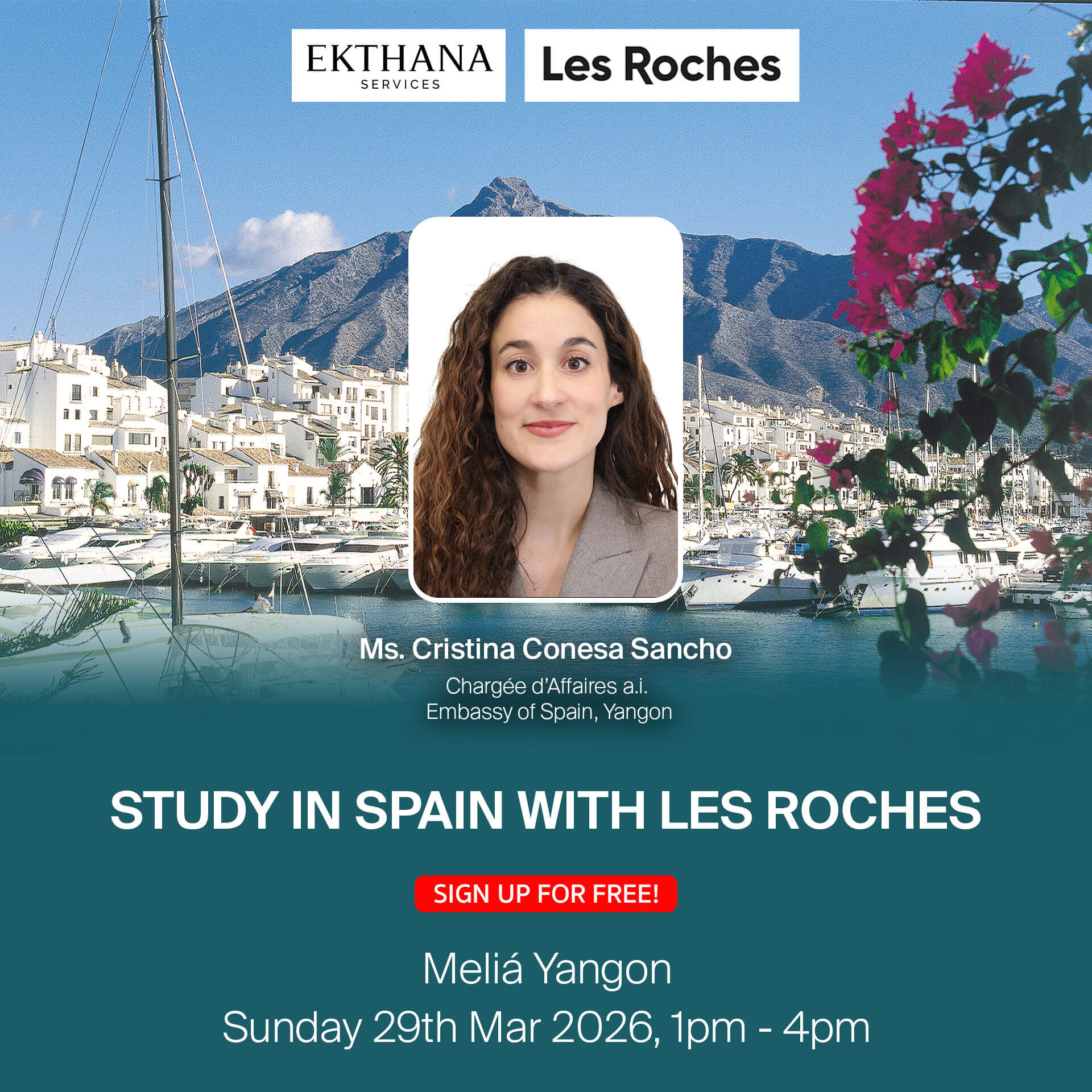 At this exclusive seminar, we are honored to welcome Ms. Cristina Conesa Sancho, Chargée d’Affaires a.i. at Embassy of Spain in Yangon as our special guest. Join us to explore the exceptional value of studying hospitality and business management in Marbella, Spain.